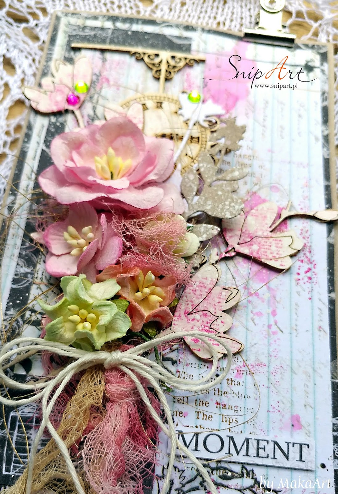 This time I have for you my mixed media wedding card "Moments". For this card I used kraft paper as the base and patterned paper in white with elegant black motives. I decorated it by the help of paper embellishments, gauze, twine, adhesive stones and beautiful SnipArt chipboards...