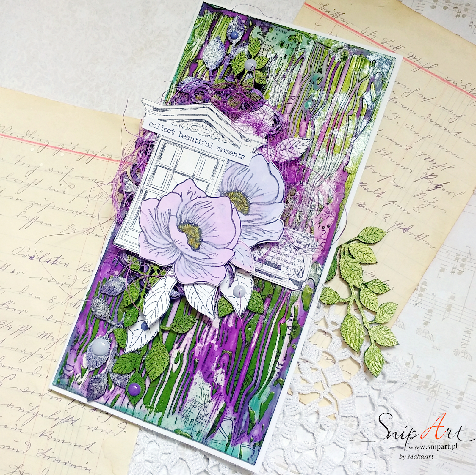 I created a layered mixed media card with green and violet shades...